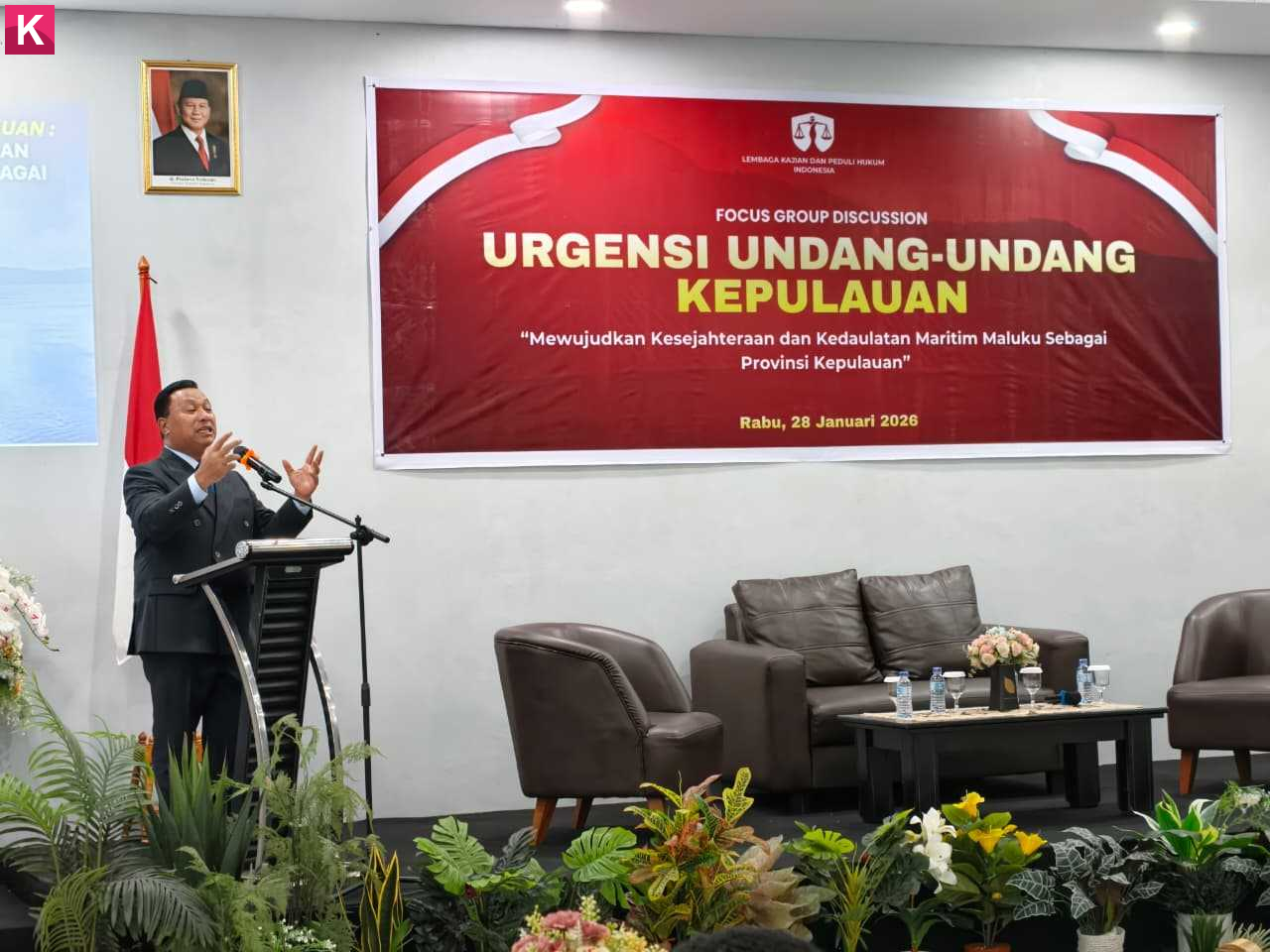AMBON, KutiKata.com - Wakil Gubernur Maluku, Abdullah Vanath, menegaskan pentingnya segera menghadirkan Undang-Undang Kepulauan sebagai landasan hukum yang adil bagi provinsi-provinsi berciri kepulauan, khususnya Maluku, dalam pengelolaan wilayah laut dan distribusi anggaran negara. Penegasan tersebut disampaikan Wagub saat membuka Focus Group Discussion (FGD) Urgensi Undang-Undang Kepulauan dengan tema “Mewujudkan Kesejahteraan dan Kedaulatan Maritim Maluku sebagai Provinsi Kepulauan” yang digagas oleh Lembaga Kajian dan Peduli Hukum Indonesia (LKPHI), Bertempat di Lantai 4 Hotel Grand Avira. Rabu (28/01/2026)